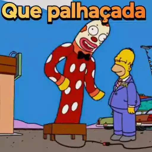Um personagem de palhaço alto e magro com um macacão vermelho com manchas brancas e uma careta de dor ou surpresa ao lado de Bart Simpson vestido de azul, com a frase 'Que palhaçada' acima deles.