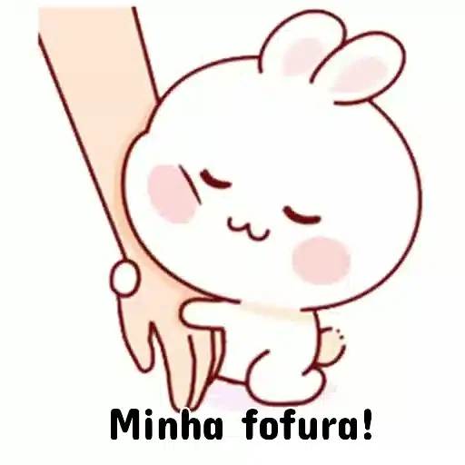 Um coelho branco fofinho com olhos fechados e bochechas rosadas sendo abraçado, com o texto 'Minha fofura!' embaixo.