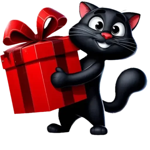 Gato preto animado segurando um presente vermelho com faixa vermelha.