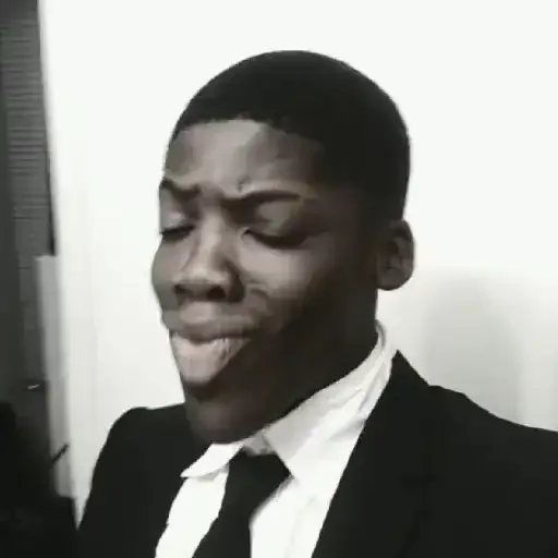 Homem negro sorrindo, com olhos fechados, usando terno preto e gravata preta, camisa branca.