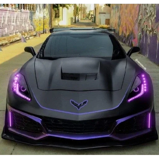 Um carro esportivo preto com detalhes em roxo, incluindo faróis e uma faixa de luz roxa na frente, estacionado em uma rua com paredes grafitadas.