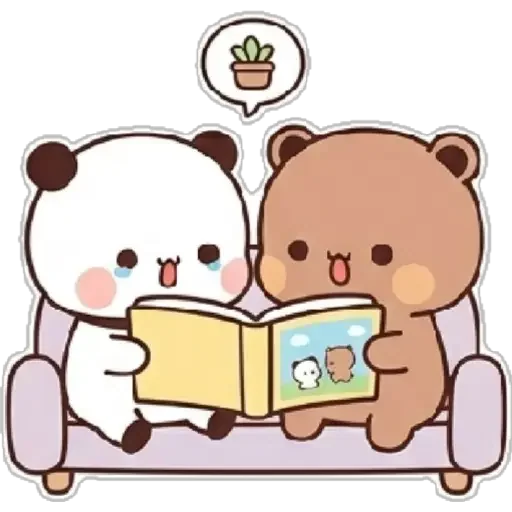 Dois ursinhos fofos sentados no sofá lendo um livro, um branco e um castanho, com um speech bubble acima mostrando uma pequena planta em um vaso.
