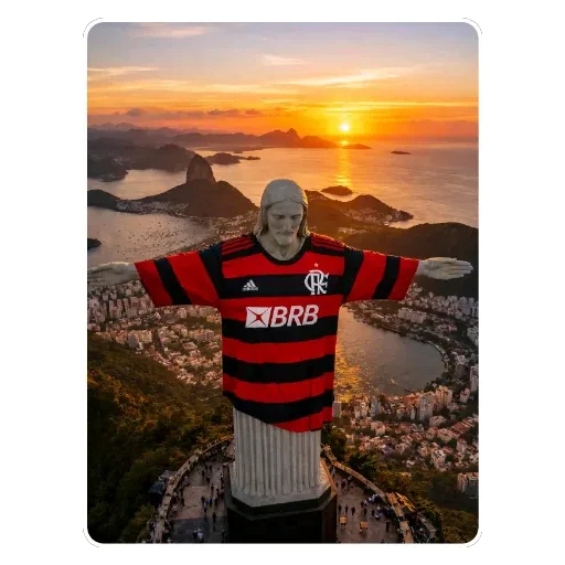 Estátua do Cristo Redentor vestindo uma camisa de futebol listrada em vermelho e preto com a logo BRB, ao pôr do sol com vista para o Rio de Janeiro.