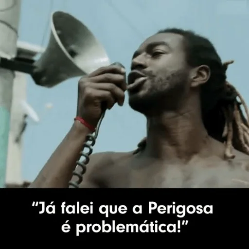 Homem com dreadlocks falando em um megafone com o texto "Já falei que a Perigosa é problemática!"