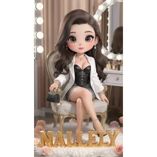 Boneca de estilo anime sentada em uma cadeira dourada, vestindo um vestido preto e branco, com o nome 'ELIZABETH' em…