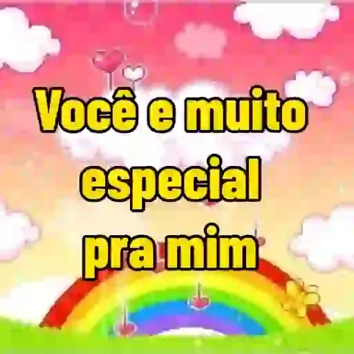 Um arco-íris colorido com nuvens brancas e rosadas no céu, com o texto "Você e muito especial pra mim" em letras amarelas.