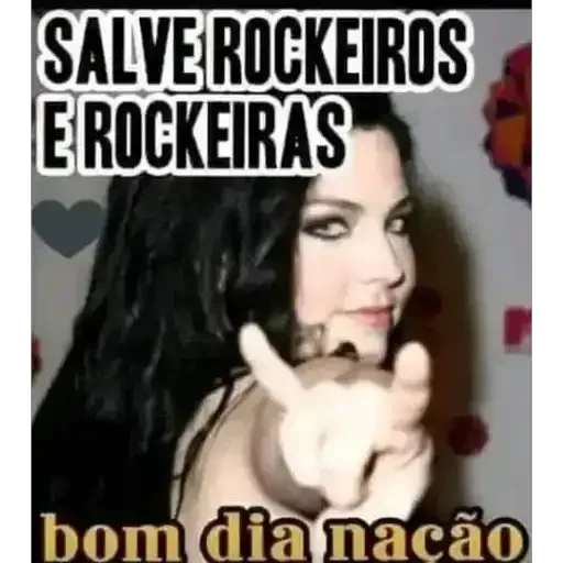 Uma mulher com cabelo preto fazendo um gesto com a mão, com o texto 'SALVE ROCKEIROS E ROCKEIRAS' em preto na parte superior e 'bom dia nação' em amarelo na parte inferior.