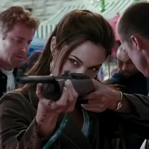 Uma mulher apontando uma arma de fogo, com um homem ao lado ajudando-a a mirar. Ao fundo, outro homem observa a cena.