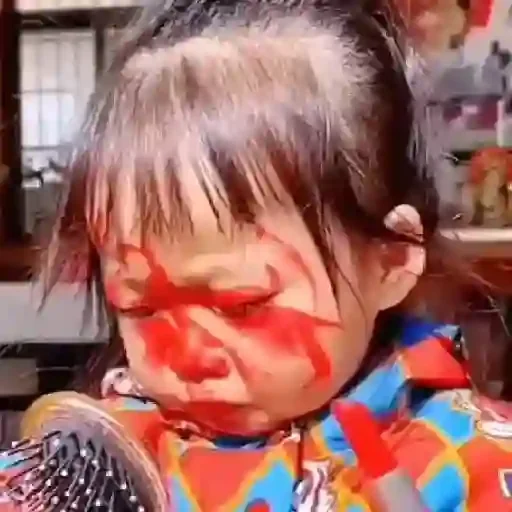 Menina com marcas de batom vermelho no rosto e cabelo castanho, usando um casaco colorido.