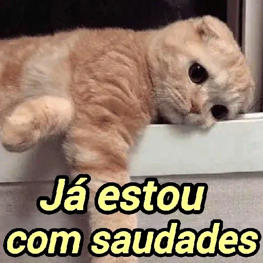 Gato de cor laranja claro com expressão triste, apoiado em uma superfície branca. Abaixo dele, o texto 'Já estou com saudades' aparece em amarelo.