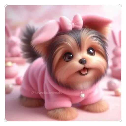Um cachorrinho Yorkshire Terrier fofinho vestindo uma roupa rosa e um laço rosa no cabelo, com olhos grandes e expressivos.