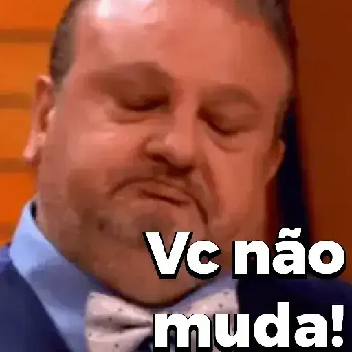 Homem de meia-idade com expressão séria e olhos fechados, usando um terno e gravata. Sobreposto com o texto 'Vc não muda!'.