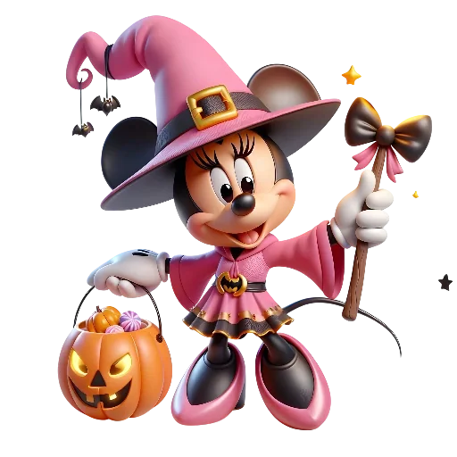 Minnie Mouse vestida de bruxa rosa com chapéu, varinha e balde de abóbora de Halloween.