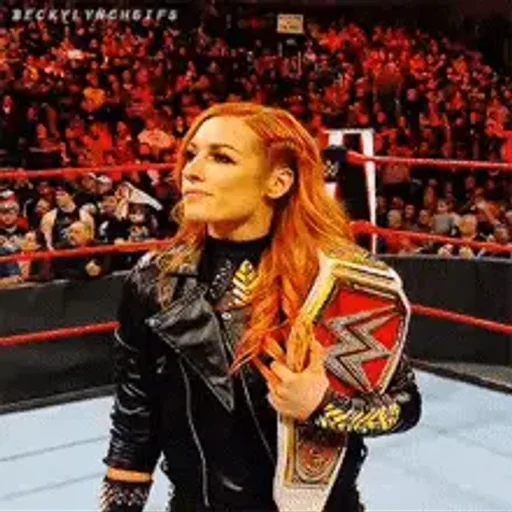 Mulher loira ruiva com jaqueta preta segurando um cinturão de wrestling, em um ringue com público ao fundo.