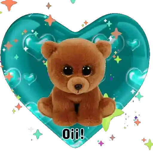 Um ursinho de pelúcia marrom sentado em um coração azul turquesa com estrelas coloridas e o texto 'Oii!' embaixo.