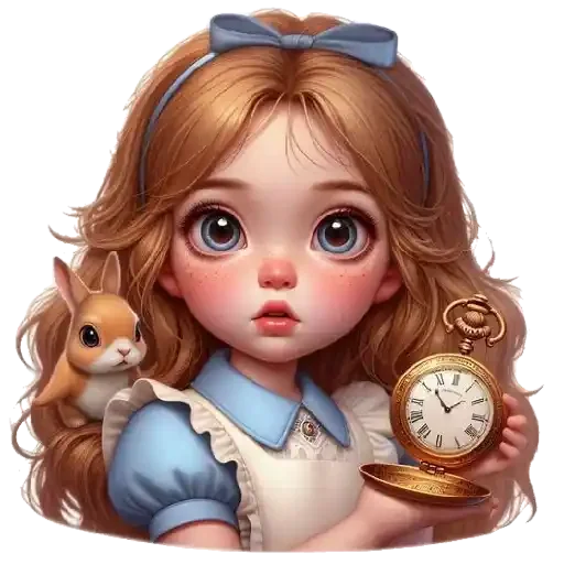Menina com cabelo castanho e olhos azuis, vestida com um avental branco e uma blusa azul, segura um relógio de bolso dourado e tem um coelho ao lado. Ela usa uma faixa azul no cabelo.