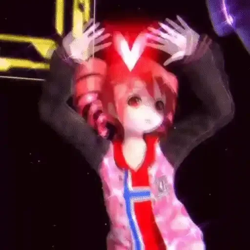 Uma personagem de anime com cabelo rosa e chifres, vestida com uma saia vermelha e um colete azul, fazendo uma careta…
