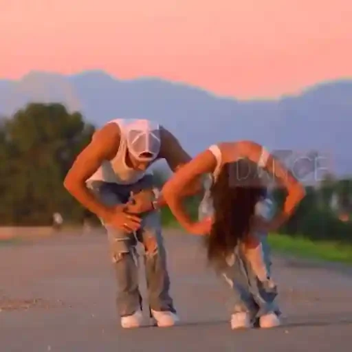 Um casal fazendo um gesto de sincronia, com as mãos nas costas e cabeças baixas, em uma estrada com montanhas ao fundo ao pôr do sol.