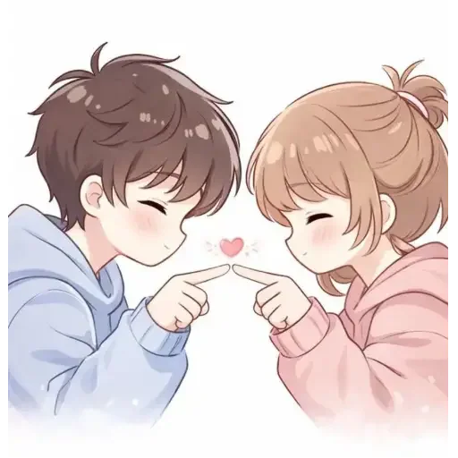 Um casal de anime, um homem e uma mulher, estão se olhando e tocando as pontas dos dedos, com um coração rosa entre eles. O homem tem cabelo castanho e veste uma blusa azul, enquanto a mulher tem cabelo loiro e veste uma blusa rosa.