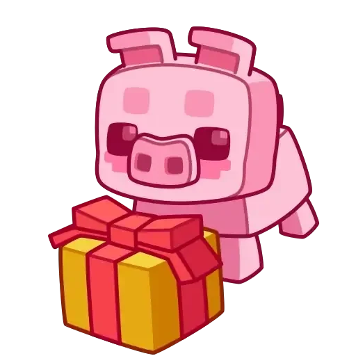 Um porco rosa de desenho animado com olhos castanhos e bochechas rosadas, com um presente vermelho e amarelo com um laço.
