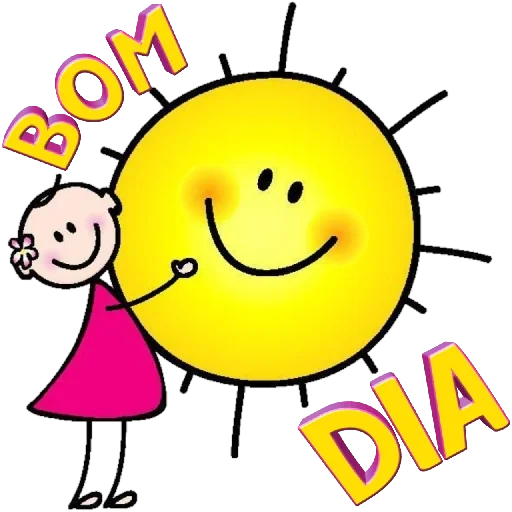 Uma menina de vestido rosa ao lado de um sol amarelo com um sorriso, com as palavras 'BOM DIA' em letras coloridas.