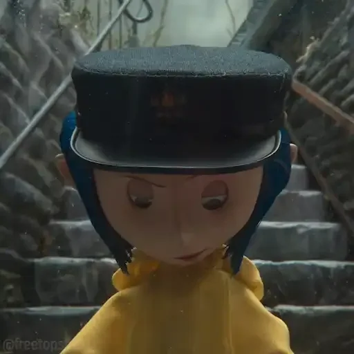 Menina de olhos arregalados e expressão surpresa, vestindo um casaco amarelo e um chapéu preto, em uma escada cinzenta.