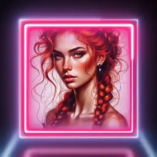 Uma mulher jovem com cabelos vermelhos ondulados e trançados, olhar sério e delineado, em um quadrado rosa com contorno de neon.