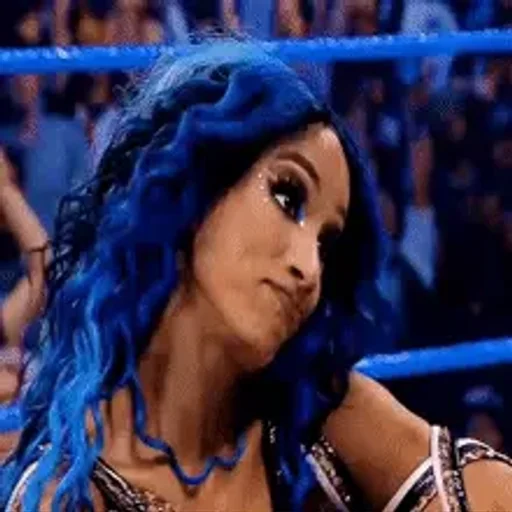 Uma mulher com cabelo azul longo e ondulado, maquiagem pesada e um colar azul, parecendo uma lutadora de wrestling, em um ringue com cordas azuis e uma multidão ao fundo.