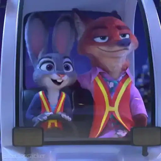Dois personagens de desenho animado, um coelho cinza e um raposa laranja, estão dentro de um carro. Eles estão usando coletes refletivos vermelhos e amarelos.