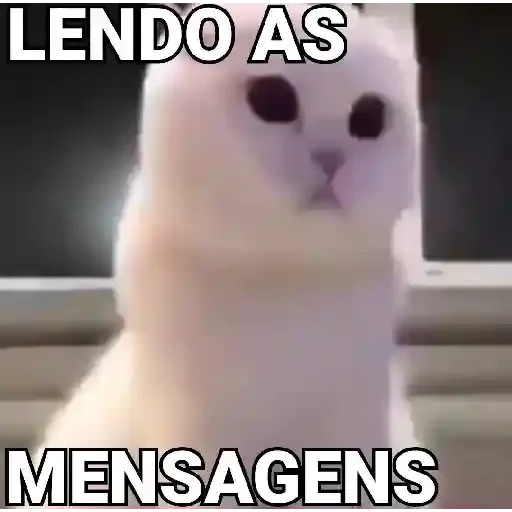 Gato branco com olhos pretos e expressão séria, legenda 'LENDO AS MENSAGENS'