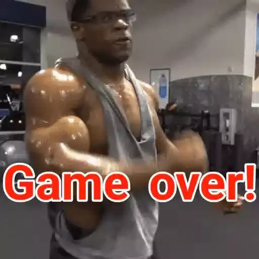 Um homem musculoso com óculos e camiseta cinza, com os braços flexionados e suados, em uma academia. Sobreposto à imagem, o texto 'Game over!' em vermelho.