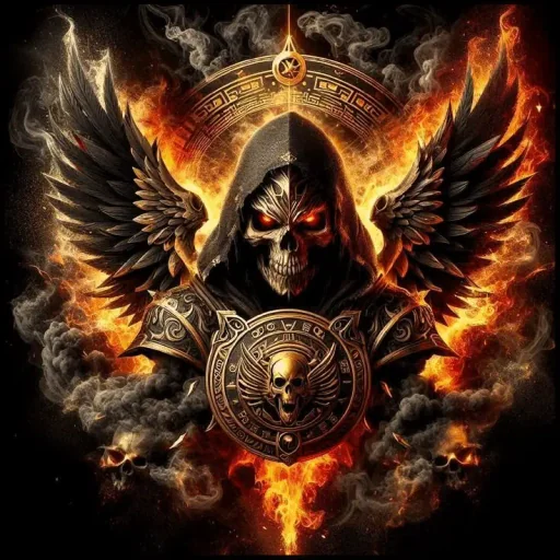 Uma figura sombria com uma caveira e capuz, asas e armadura, cercada por chamas e fumaça, com um escudo decorado com outra caveira no peito.