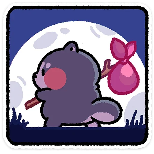 Um desenho de um animal cinza, provavelmente um rato ou esquilo, segurando um objeto vermelho em frente à lua cheia. O animal tem uma mancha rosa no rosto e está em frente a uma lua cheia com manchas.