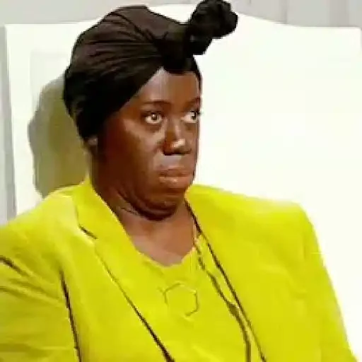 Mulher negra com expressão de surpresa ou preocupação, vestindo um blazer escuro, em um ambiente com cortina ao fundo.