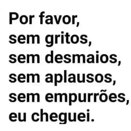 Um texto preto em fundo branco que diz: 'Por favor, sem gritos, sem desmaios, sem aplausos, sem empurrões, eu cheguei.'