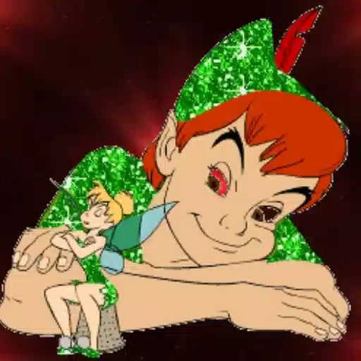 Peter Pan com Tinker Bell em seus braços, ambos com expressão sorridente. Peter Pan tem cabelo vermelho e uma touca verde brilhante.