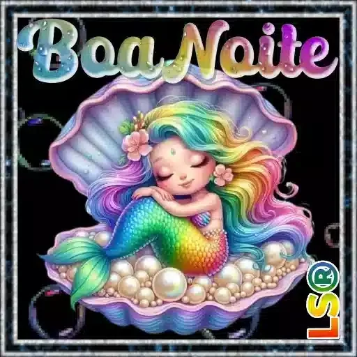 Uma sereia colorida com cabelos e cauda arco-íris dormindo dentro de uma concha com pérolas, com a frase 'Boa Noite' acima dela.