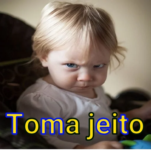 Menina loira com expressão séria e braços cruzados, olhando para frente. Sobreposto à imagem, o texto 'Toma jeito'.