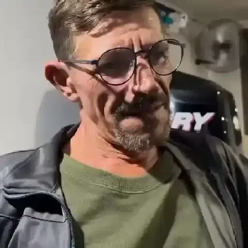 Homem com óculos e jaqueta preta, parecendo surpreso ou confuso, com uma expressão facial engraçada.