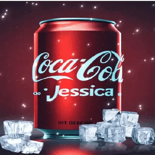 Uma lata de Coca-Cola com o nome 'Jessica' personalizado, rodeada de cubos de gelo em um fundo vermelho escuro com estrelas de luz.