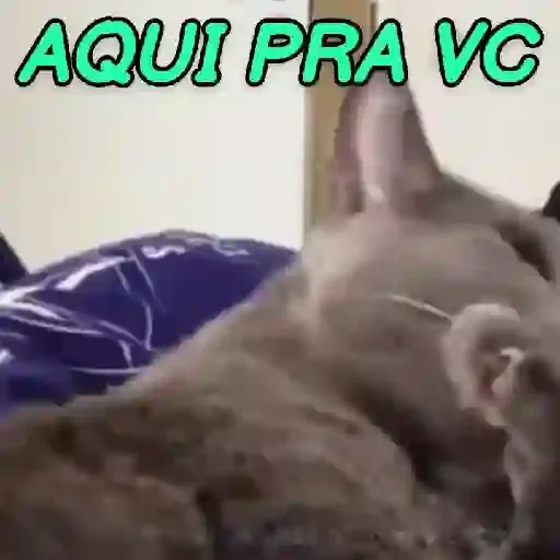 Gato deitado com a expressão relaxada, ao lado de uma coberta azul. O texto 'AQUI PRA VC' aparece em letras verdes.