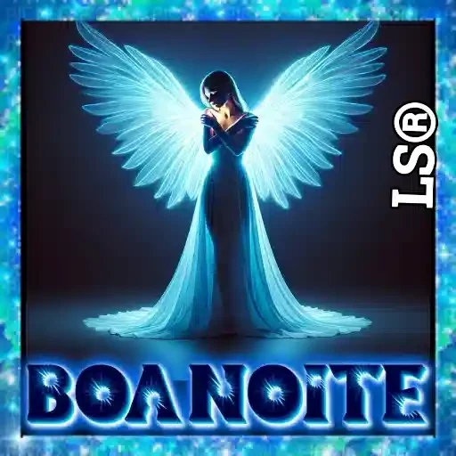 Uma mulher com asas de anjo e vestido azul, rezando com as mãos no rosto. Ela está em um fundo escuro com efeito de luz. Abaixo dela, está escrito 'BOANOITE'.