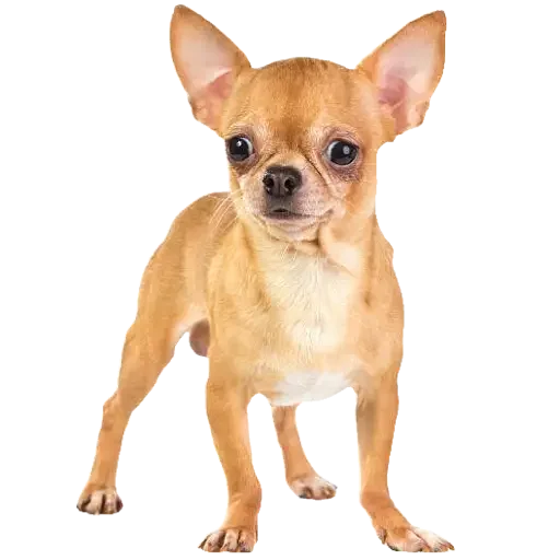 Um cachorro Chihuahua de pelo curto e liso, cor dourada com manchas brancas no peito e focinho.
