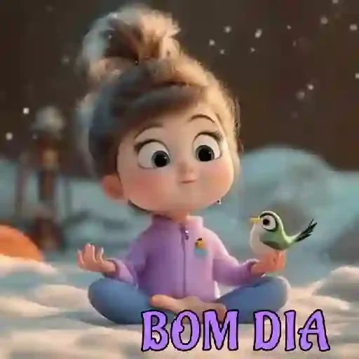 Menina sentada na neve com um passarinho na mão, desejando bom dia. Ela está usando uma jaqueta roxa e tem o cabelo castanho preso.