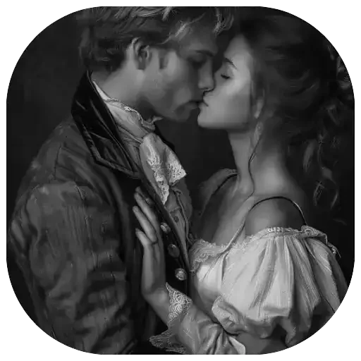 Um casal se beijando, o homem de casaca escura e camisa clara, a mulher de vestido claro, com as mãos no peito dele.