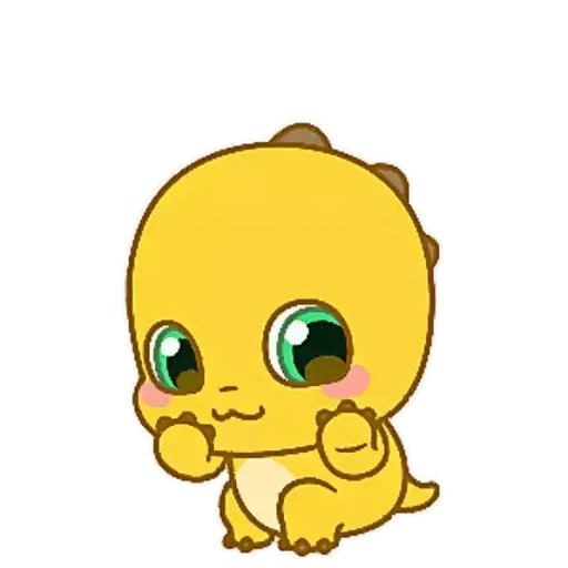 Um dinossauro amarelo fofinho com olhos verdes grandes e bochechas rosadas, fazendo um gesto com a mão.