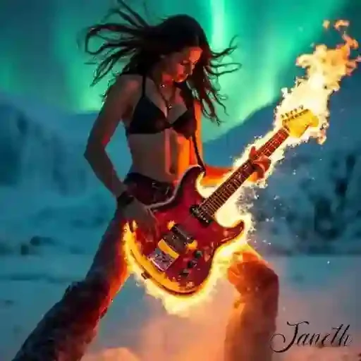 Mulher com cabelos longos e negros, usando um biquíni preto, segura um violão elétrico vermelho em chamas em um cenário de neve com aurora boreal verde ao fundo.