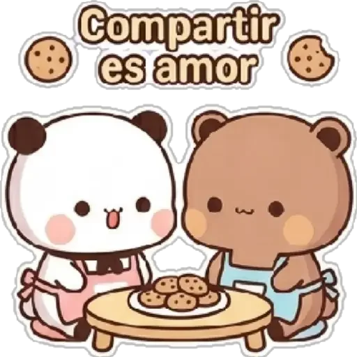 Dois ursos fofos, um branco e um castanho, sentados à mesa comendo biscoitos. O texto 'Compartir es amor' aparece acima deles.