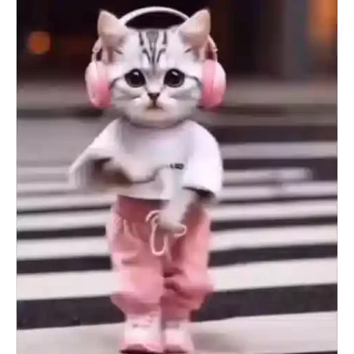 Gato com headphones rosa e roupas casuais atravessando faixa de pedestres.
