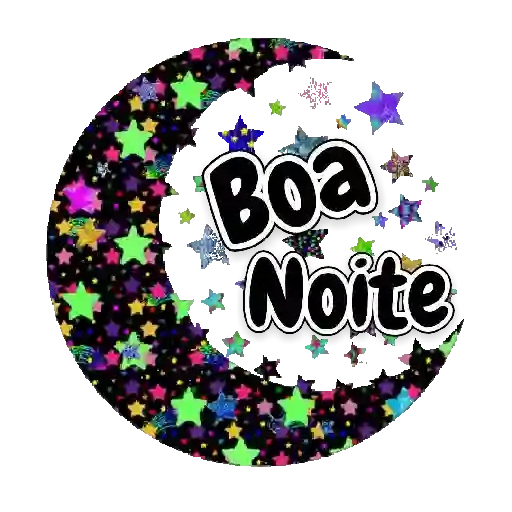 Uma lua crescente com estrelas coloridas e o texto 'Boa Noite' em preto com contorno branco.